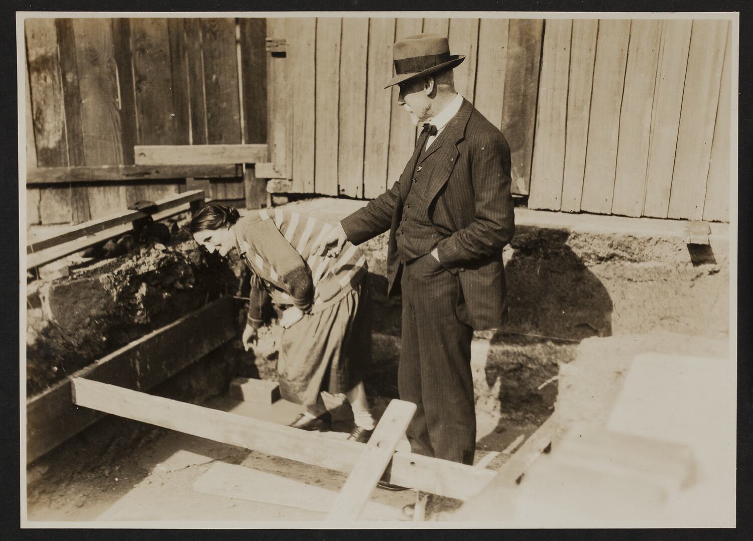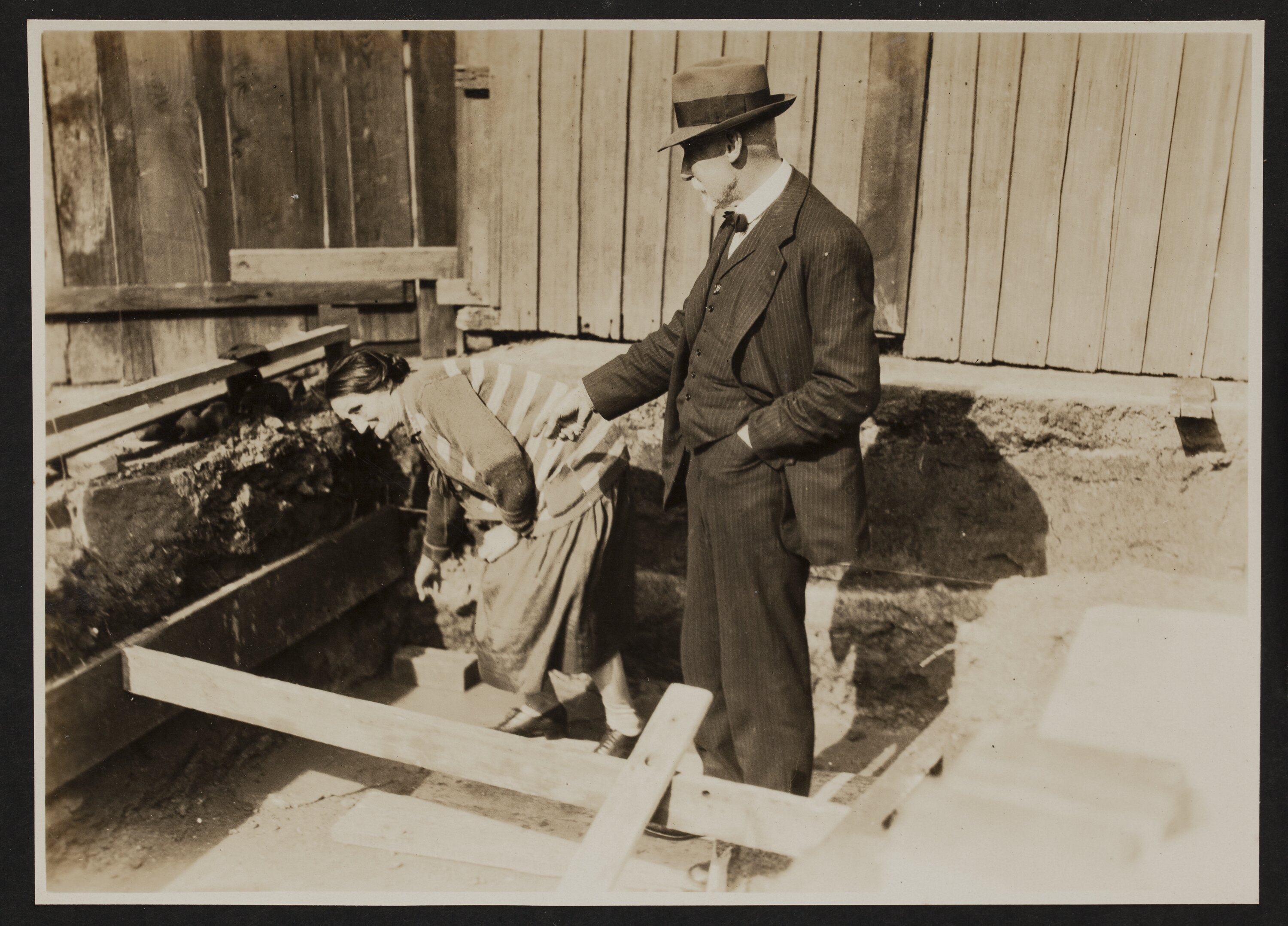 Woman wearing dress and striped cardigan and a man in a suit, bow-tie and hat are pointing to a brick on the ground. They are standing on the footings of a new building that is being constructed. There are timber supports and string set up around the footings. A fence is in the background.