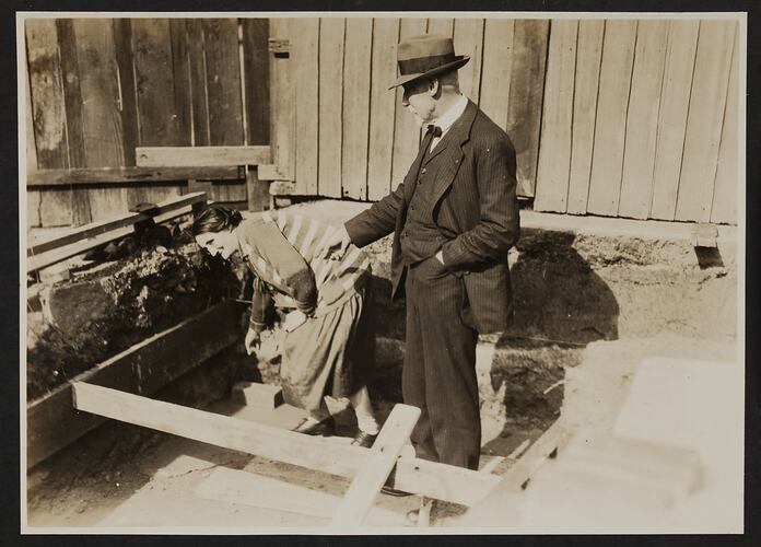 Photograph showing the ceremonial laying of the first brick for Building 4 at the Kodak Australasia Pty Ltd factory in Abbotsford, 30 April 1928. In this photograph, which is the third in a series of six documenting the event, Miss B Kingston and Mr Thomas Baker are pointing to the first brick that has been laid by Miss Kingston.