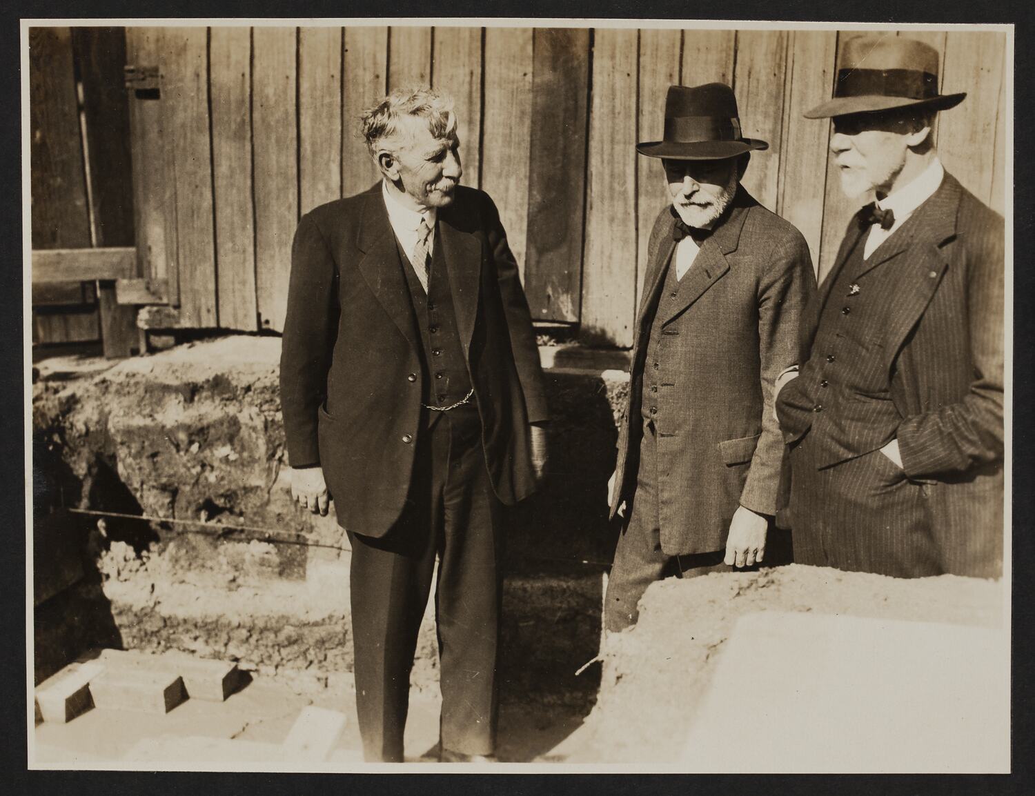 Three men in suits, the two at right wearing hats, standing on the footings of a new building that is being constructed. There are timber supports and string set up around the footings. A fence is in the background. Four bricks are laid on the ground in the corner.