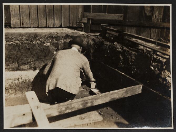 Photograph showing the ceremonial laying of bricks for Building 4 at the Kodak Australasia Pty Ltd factory in Abbotsford, 30 April 1928. In this photograph, which is the sixth in a series of six documenting the event, a man, possibly Thomas Baker or another executive, is shown laying a brick on the ground in the footings of the new building.