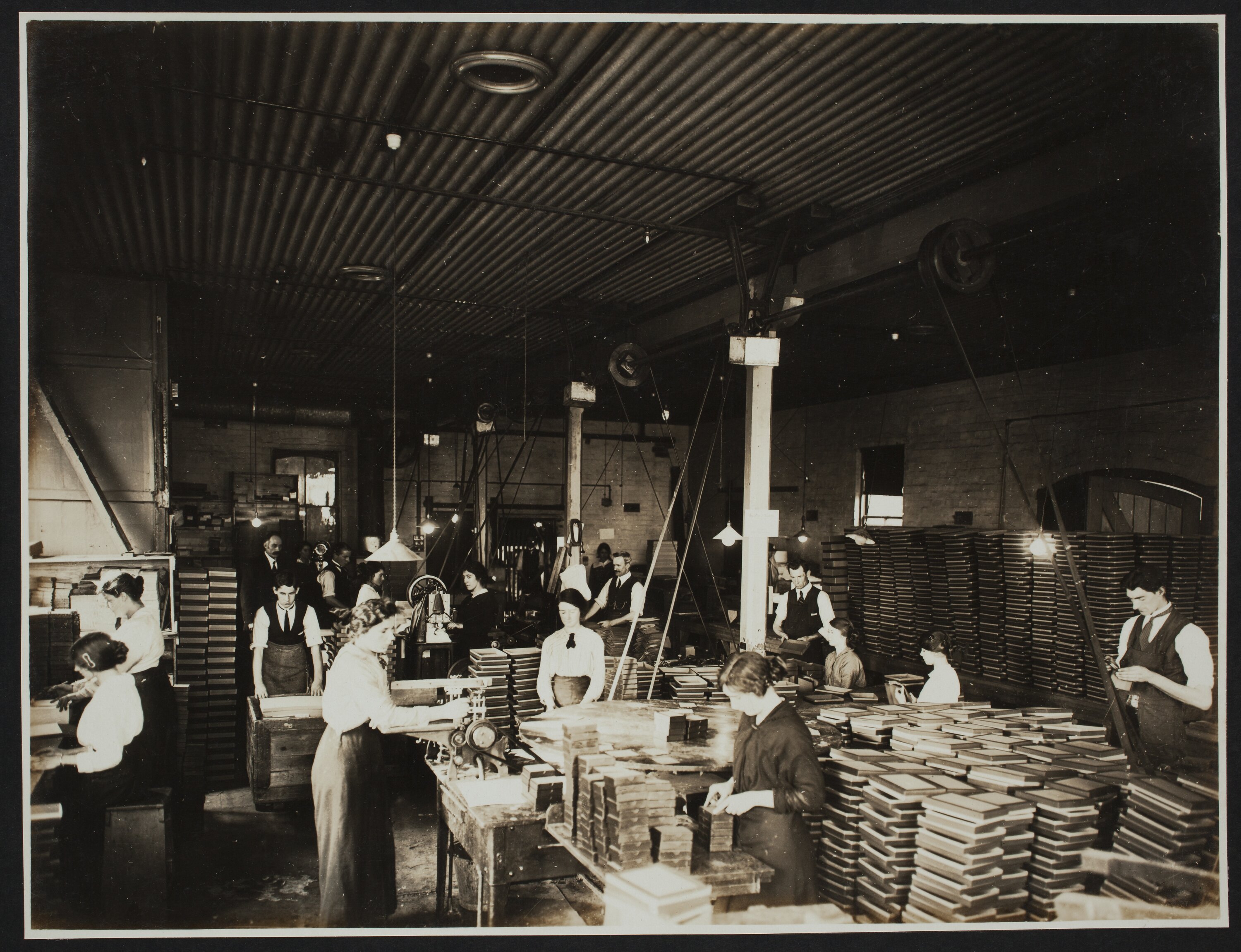 Interior photograph of workers inside a factory. Men and women are at work, with some of the women seated. The men wear long aprons over long sleeved shirts and ties. There are stacks of photograph frames and mounts on work benches. There are various belt drives attached to a gantry in the ceiling. Electric lighting hanging over work tables can be seen.