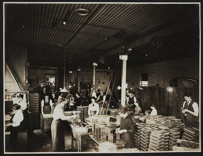 Photograph showing workers, possibly in the Framing Department, at the Kodak Australasia Pty Ltd factory in Abbotsford, circa 1928. During the first few decades of the 20th century, the factory rapidly expanded with many new buildings added to the factory site.