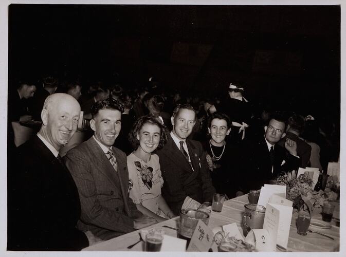 Black and white photograph of six Kodak Australasia Pty Ltd employees and guests at a 'Welcome Home Dinner to Returned Service Personnel of Abbotsford Factory', held on the 01 Feb 1947 at Melbourne Town Hall, and chaired by Edgar Rouse.