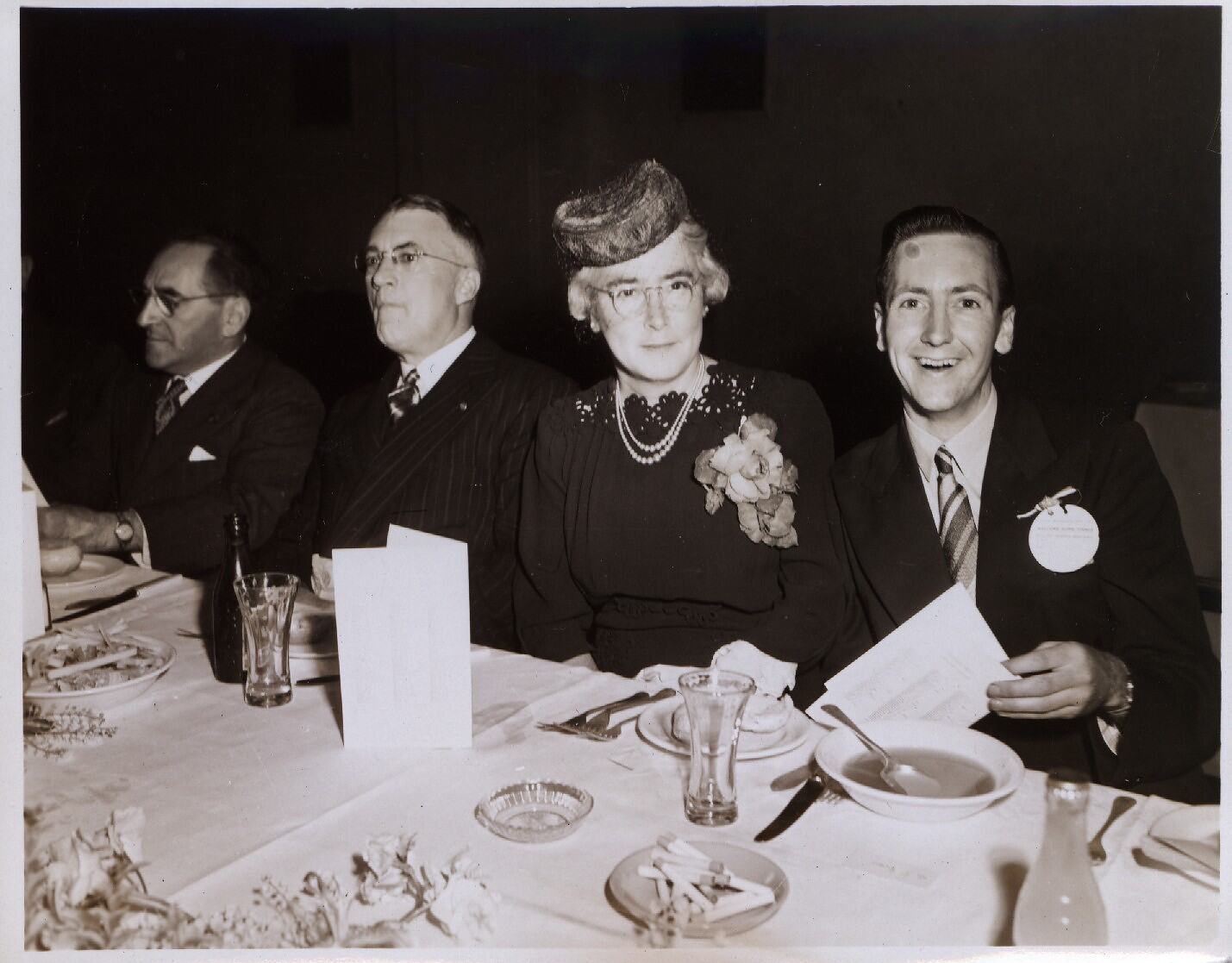 A young, smiling man with a badge on his lapel and a soup in front him, holds a menu and leans in to pose with an older woman in a pillbox hat with large corsage. In this view there are remnants of meals on the table and two other Kodak staff members are eating in the background.