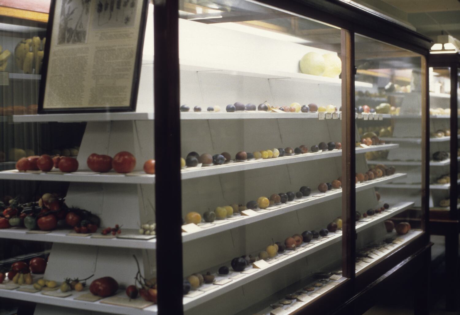 Colour slide depicting a display of wax fruit specimens, in Queens Hall, Science Museum,1969.