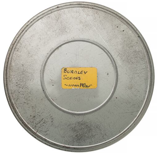 Label, handwritten, green ink on yellow paper: 'BURNLEY / SCENES / ~APPROX140M.'