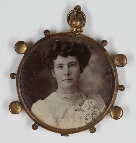 Circular pendant with photograph on each side, one Sarah Jackson, the other, her husband Arthur Jackson. It is likely to have been made around the time of their marriage in 1911.