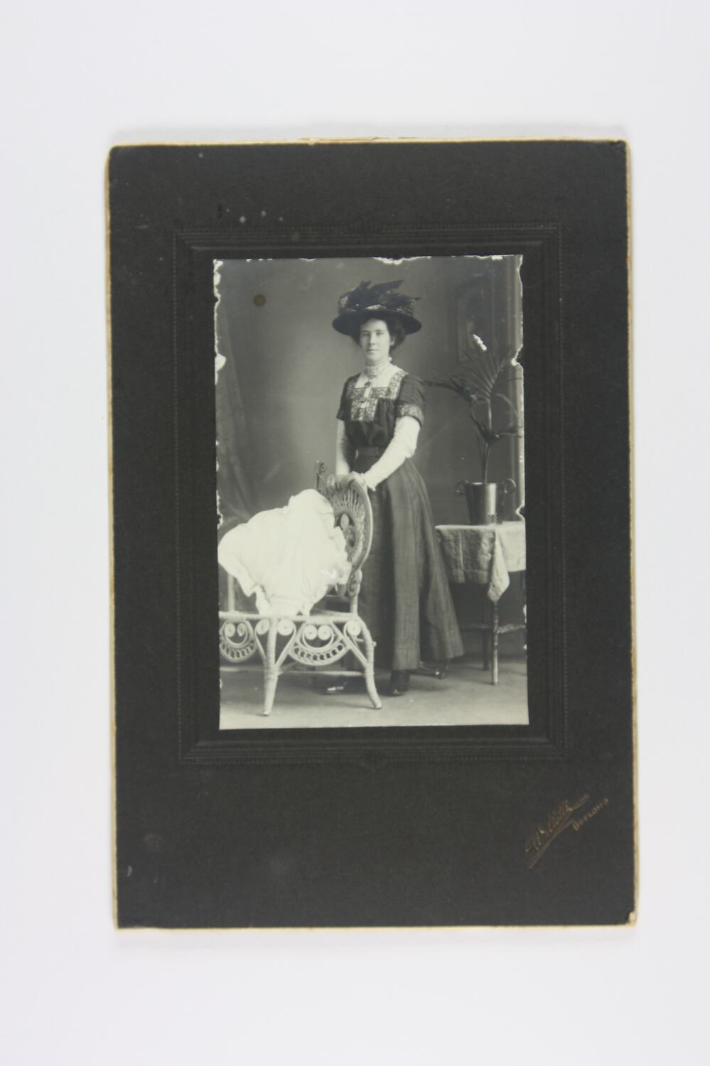 Woman holding the back of a scrolled cane chair in what is probably a studio setting. She wears a large hat with feathers (or similar), a dark, short-sleeved, ankle-length dress with square neckline and belt, a pale long-sleeved top underneath with a high collar, and a pendant at her throat. A table behind has a small potted palm on a table cloth.