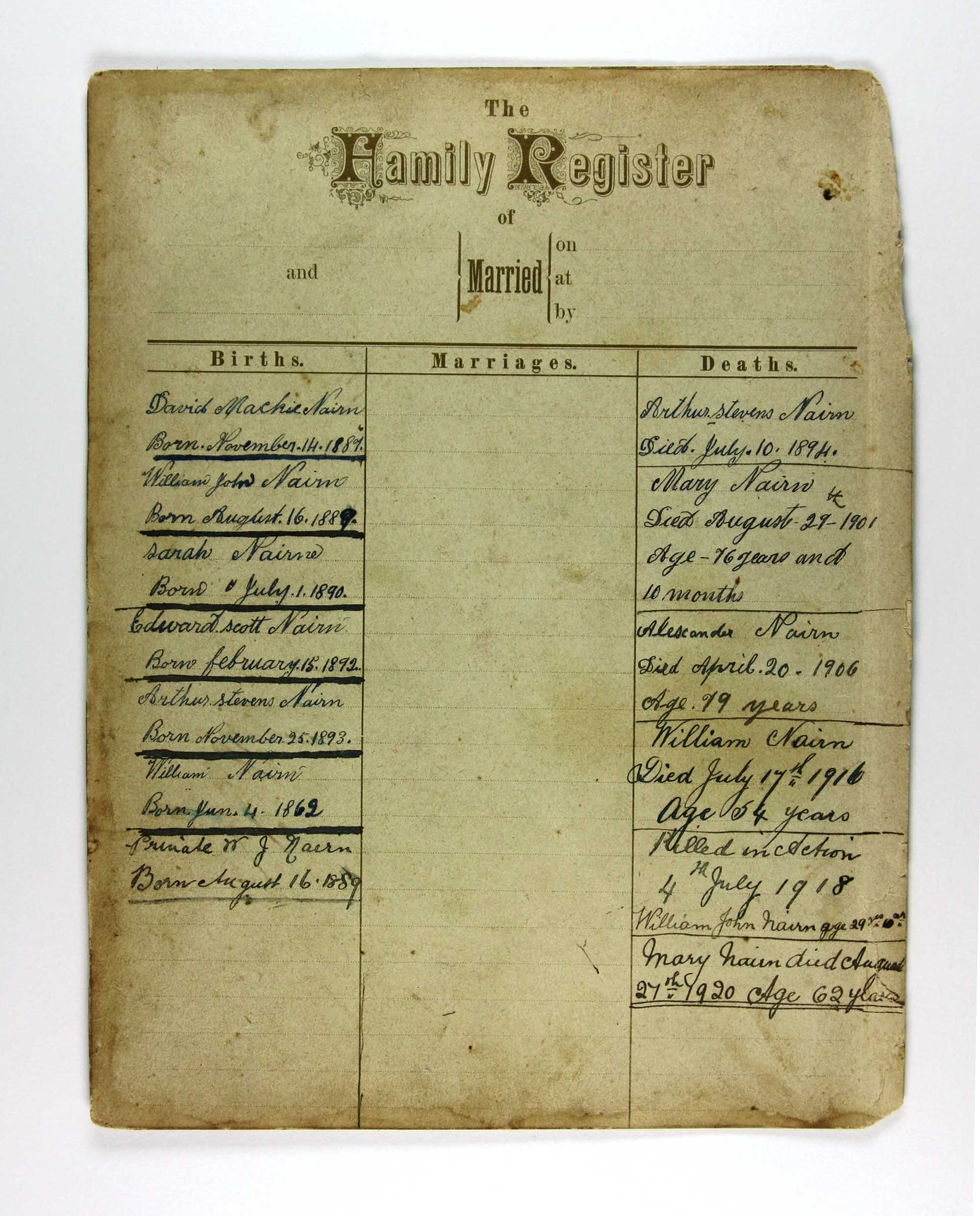 Single page 'Family Register' relating to the Nairn family, removed from book, probably a family bible. The register provides columns for Births, Marriages and Deaths; only Births and Deaths have been filled in. The register lists: