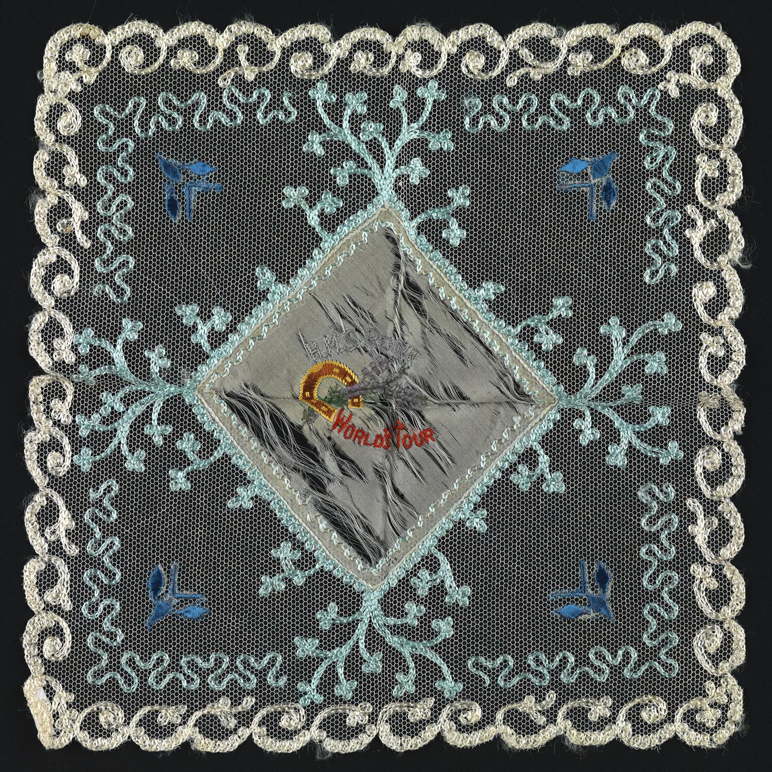 Rectangular cloth and net handkerchief with embroidered decoration and lace trim.