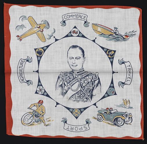 This handkerchief was produced to commemorate the visit of Prince Henry, the Duke of Gloucester, in 1934. It was held as part of the celebrations of the centenary of European settlement in Victoria in 1934.
