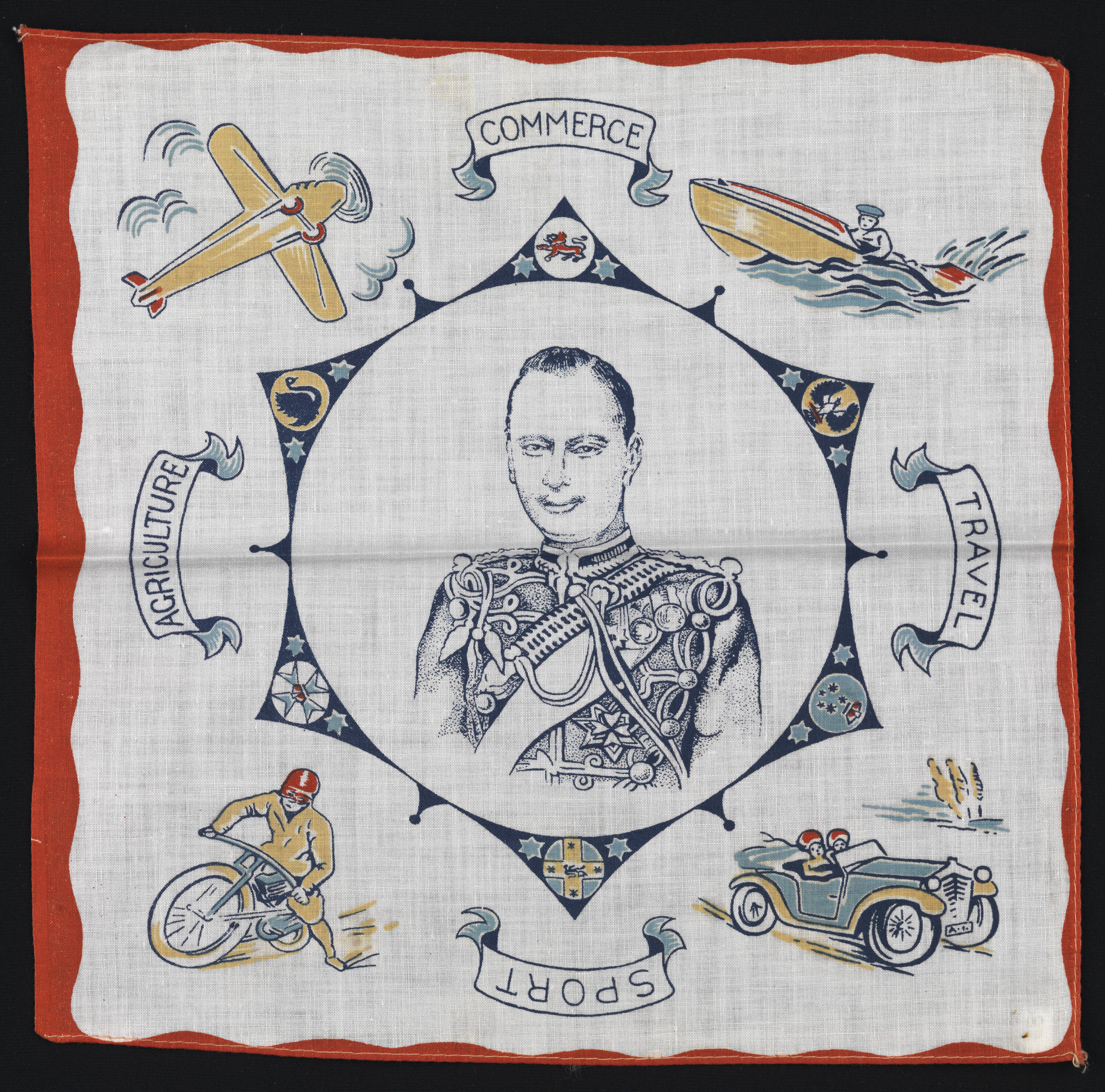 This handkerchief was produced to commemorate the visit of Prince Henry, the Duke of Gloucester, in 1934. It was held as part of the celebrations of the centenary of European settlement in Victoria in 1934.