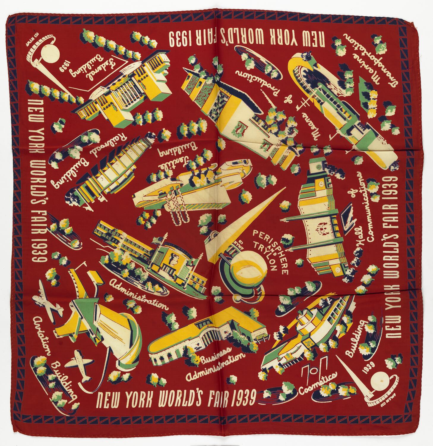 This silk scarf was produced as a souvenir of the New York World's Fair, held in 1939. It depicts various pavilions around the site.
