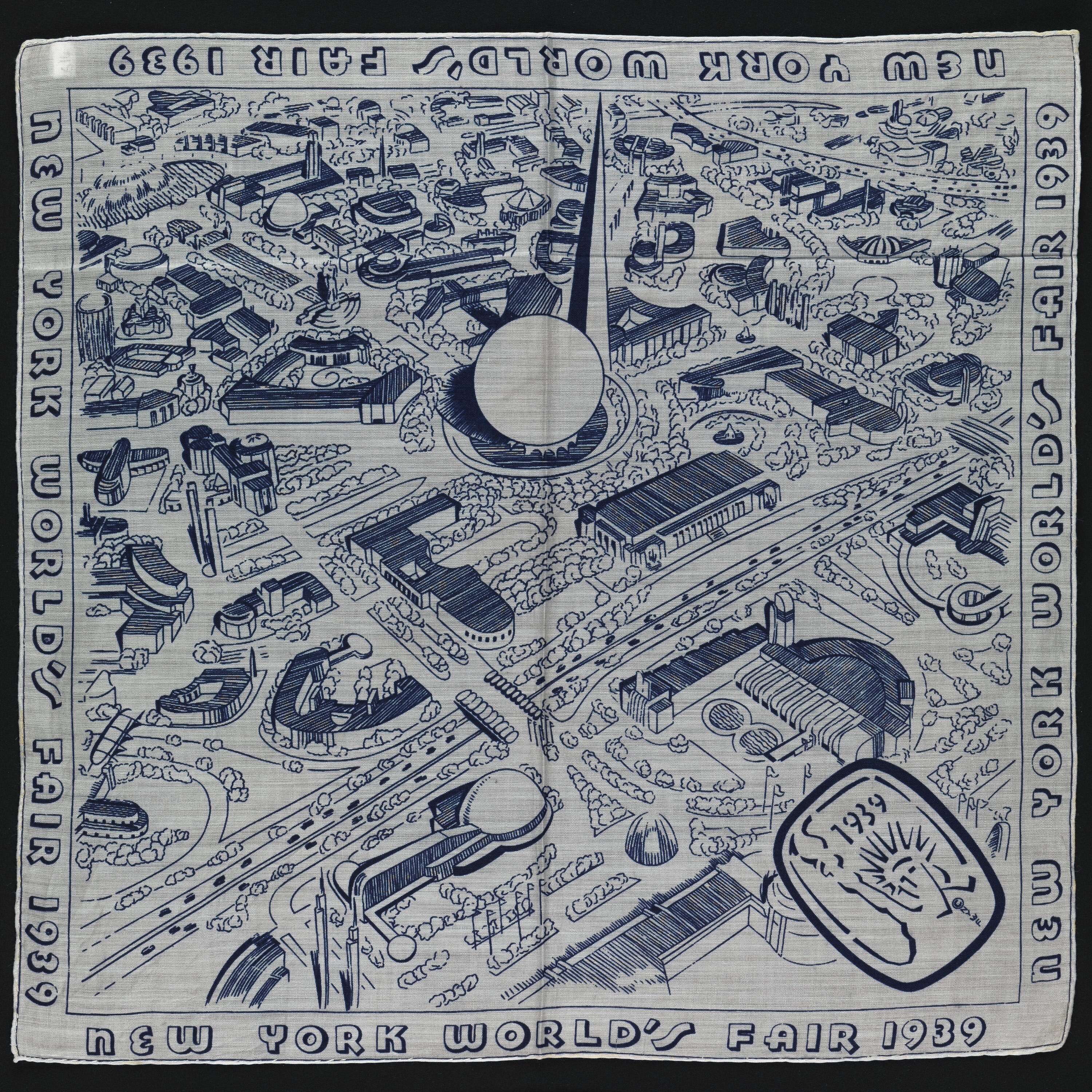 This silk handkerchief was produced as a souvenir of the New York World's Fair, held in 1939. It depicts an aerial view of the site, depicting many of the pavilions and other buildings.