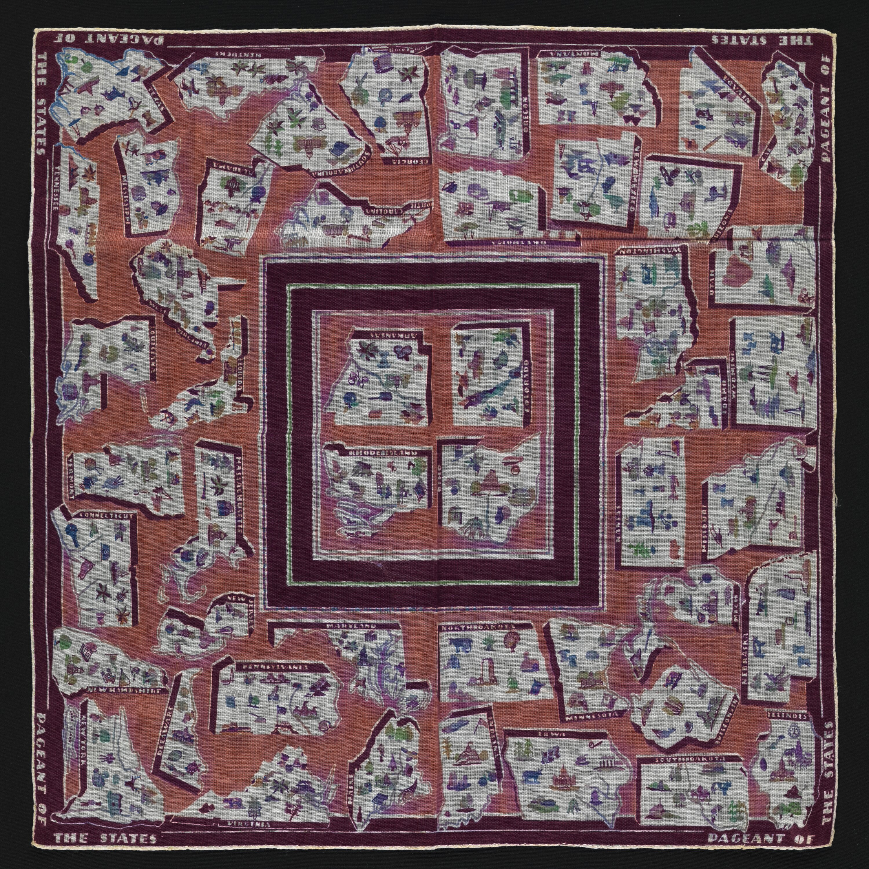 This handkerchief was produced as a souvenir of the United States of America, around the time of the New York World's Fair, held in 1939. It features all of the American states at that time.