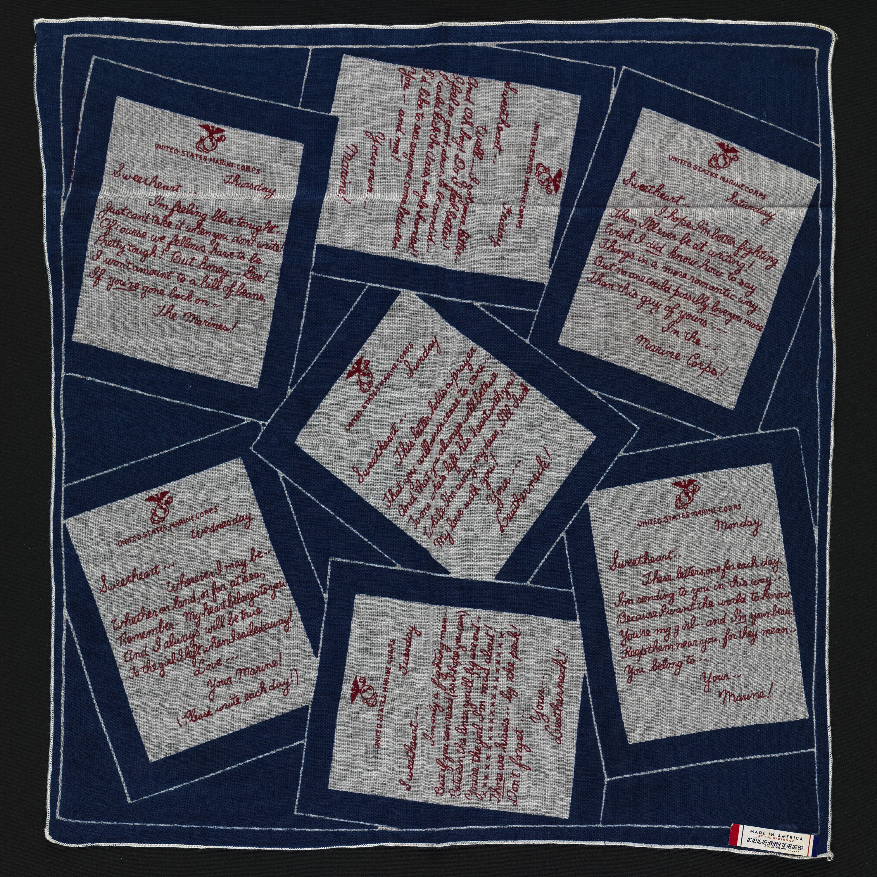 This patriotic handkerchief was produced in the USA during World War II. It features copies of letter from US marines to their sweethearts.