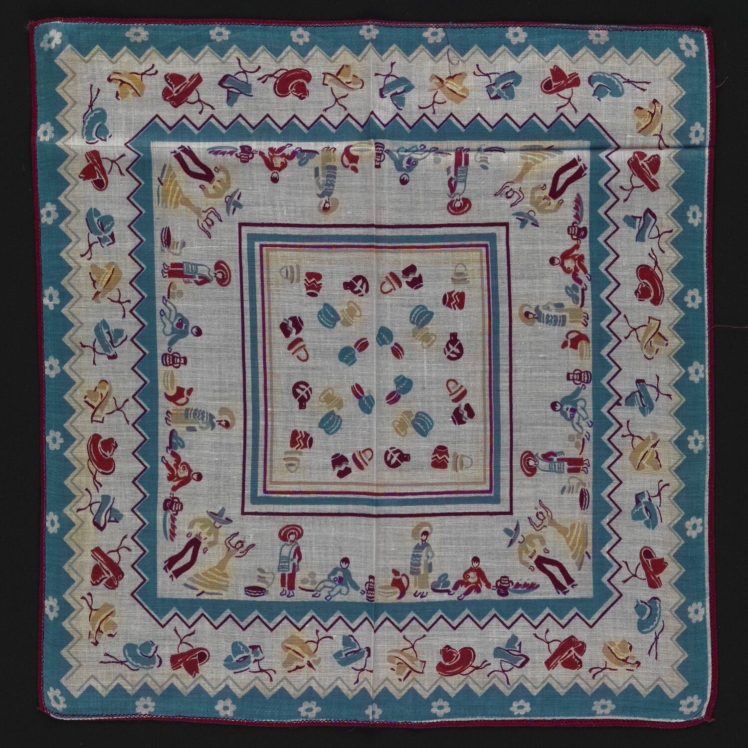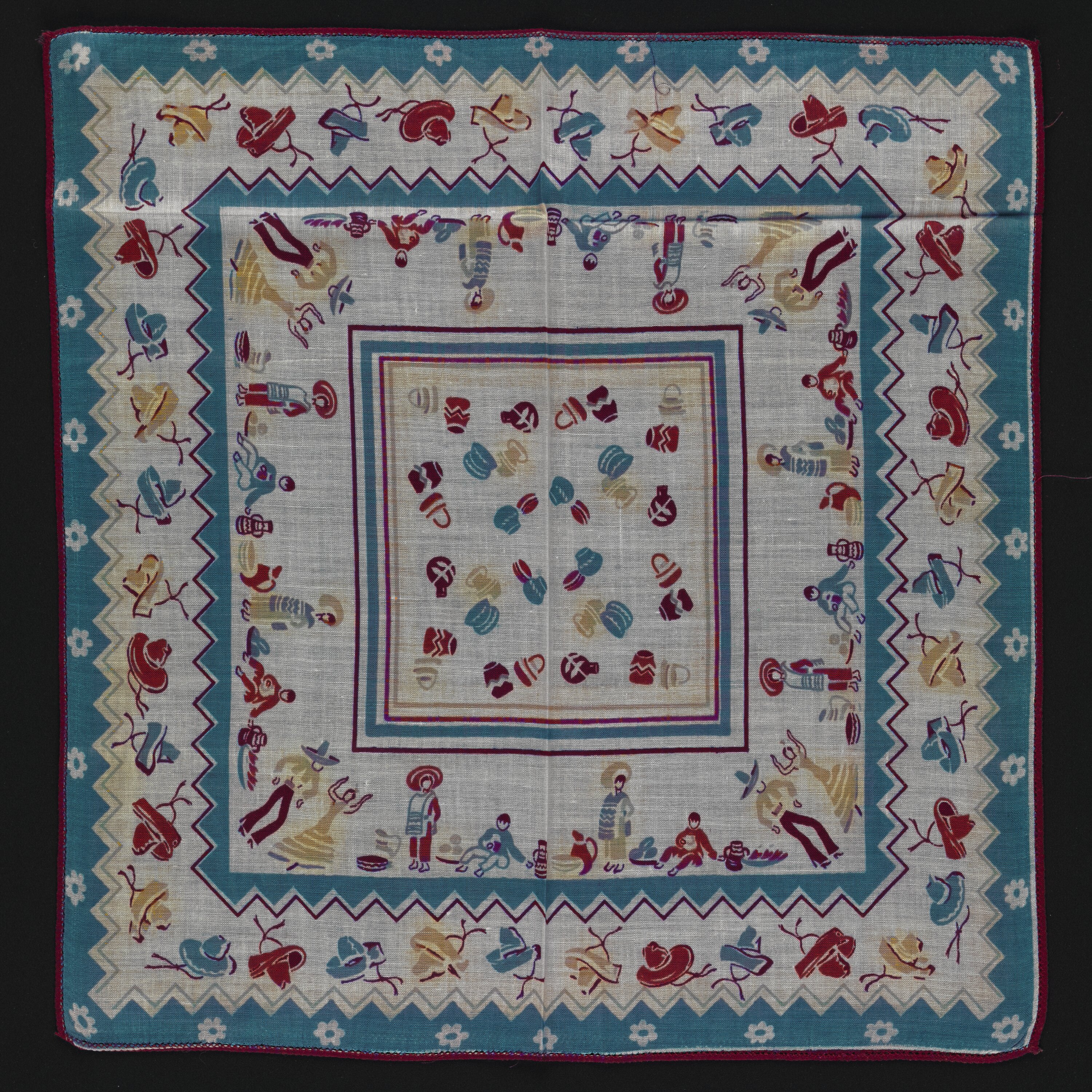 This handkerchief was produced in the USA around the time of the New York World's Fair, held in 1939. It features various Mexican motifs.
