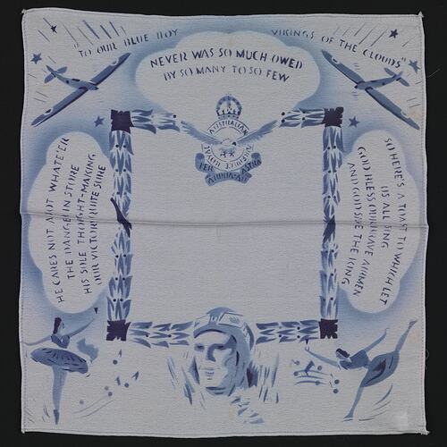 This patriotic handkerchief was produced in the United Kingdom during World War II. It commemorates the Battle of Britain, an a four month mission to protect Britain from German aerial attacks, during 1940.