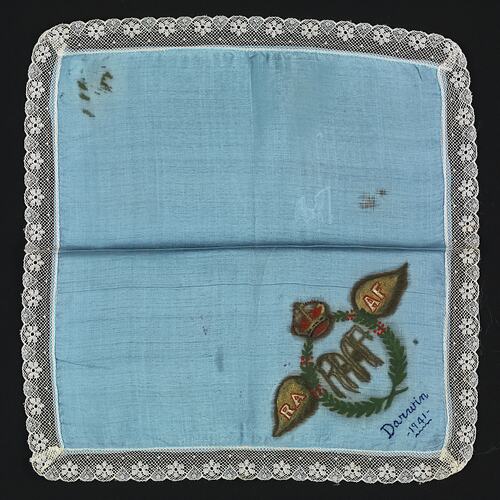 This patriotic handkerchief was produced in Australia during World War II. It commemorates the the Royal Australian Air Force's involvement in Battle of Darwin, an ongoing mission to protect Darwin from Japanese aerial attacks, during 1941.
