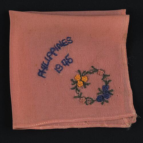 This patriotic handkerchief was produced in the USA during World War II. It commemorates the Phillipines Campaign, where American and Philippine troops fought and expelled the Japanese forces from the Philippines in 1945.