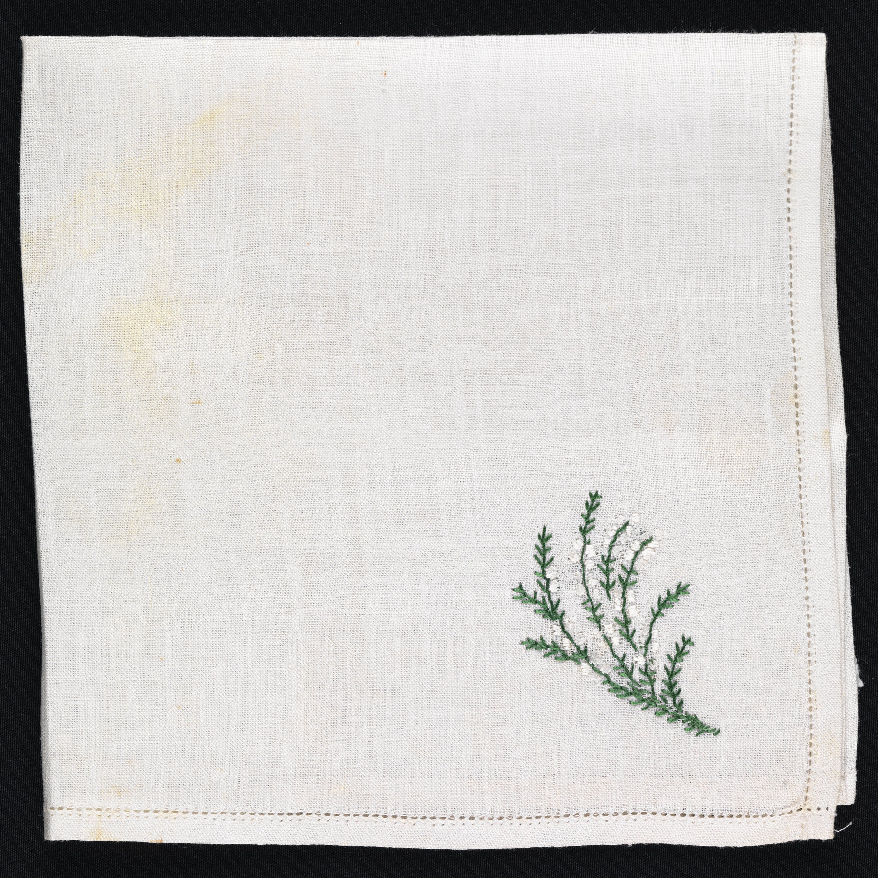 Fine white linen handerchief with finished edging and a hand-embroidered sprig of white heather in white and green silk thread in one corner.