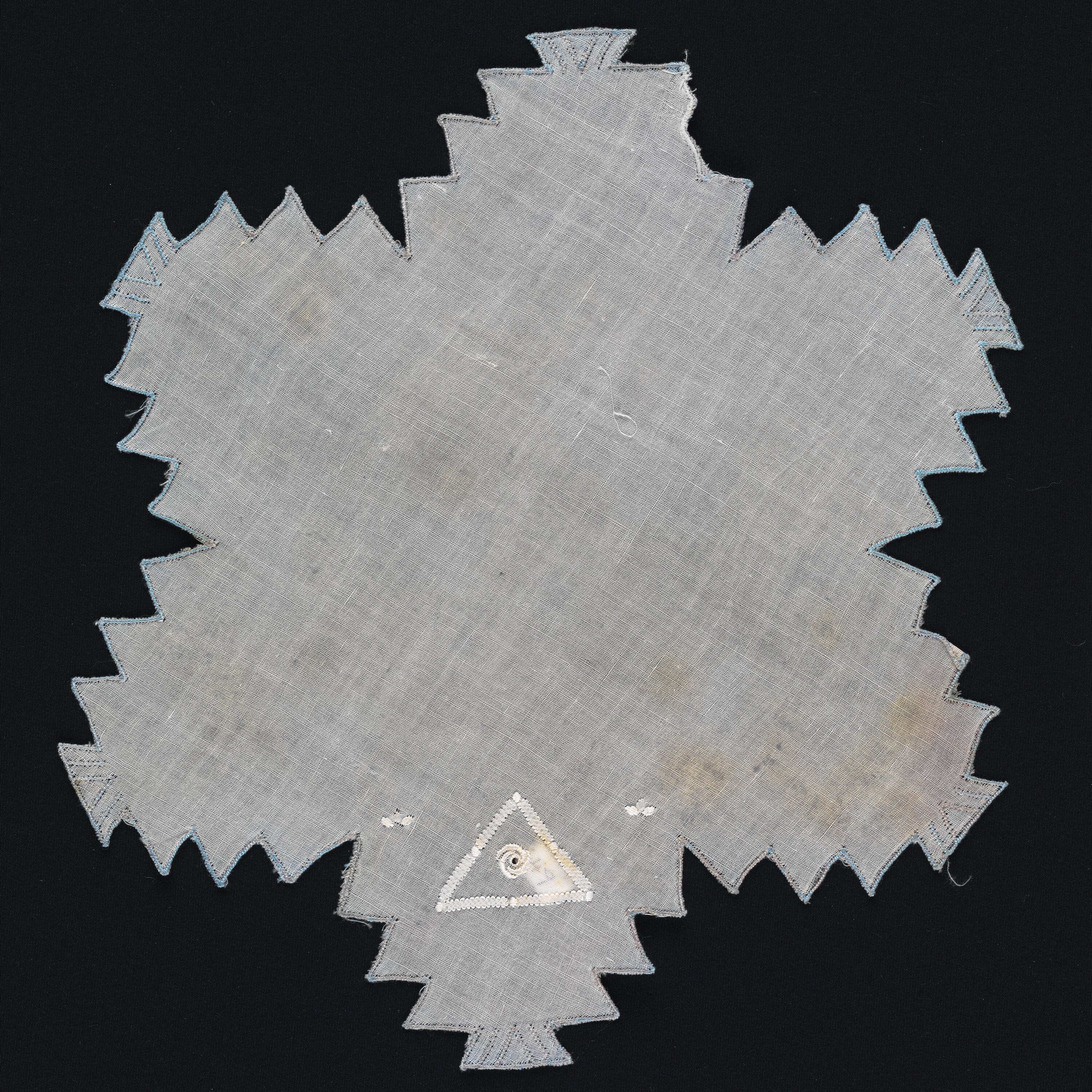 Star-shaped cotton handkerchief with blue and white overlocked zig zag edge with geometric decorative stitching at each 'point'. Pyramid embroidered at one edge of the handkerchief with a central vortex or eye shape inside it.
