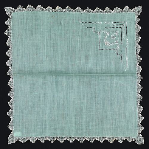 Soft, light green, fine cotton handkerchief with floral embroidery and drawn thread decoration in white cotton in one corner. The handkerchief is edged with zig zag geometric patterned lace.