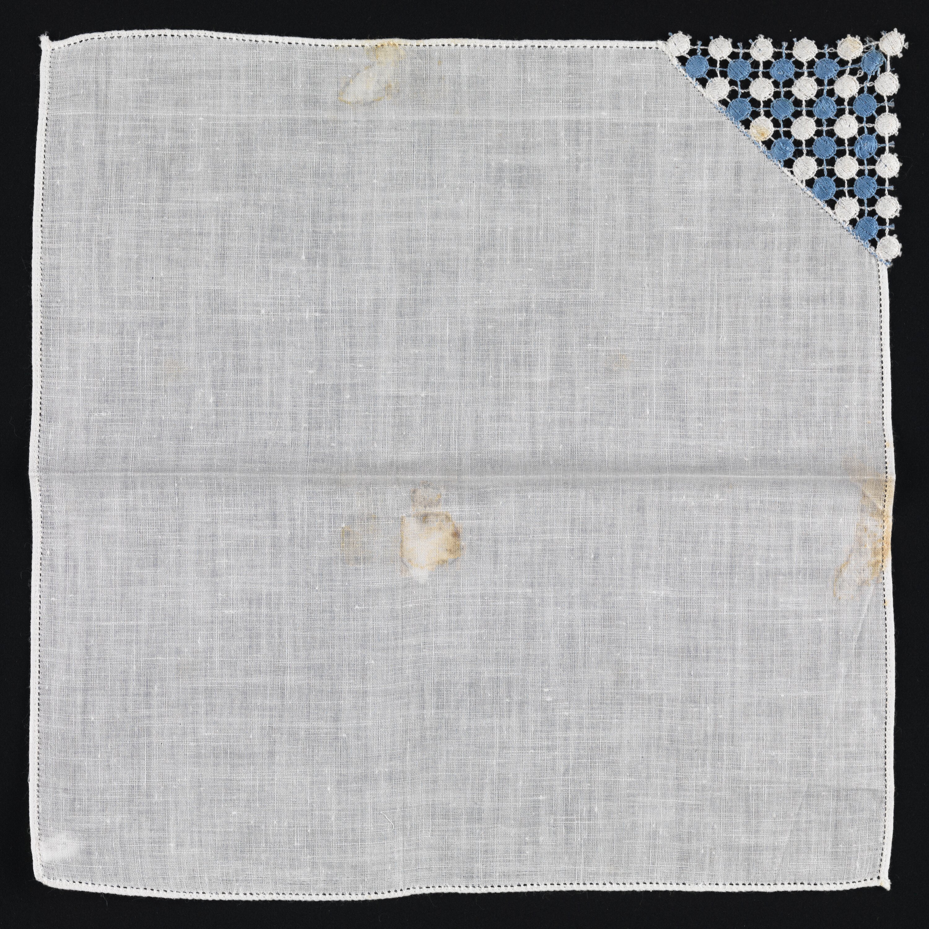 White cotton handkerchief with triangular panel of embroidered lace in blue and white cotton in one corner.