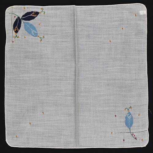 Fine white cotton handkerchief with rolled, finished edging. Two corners feature applique flower buds in navy and light blue silk. Green silk is used for stamens and there are smaller yellow and pink knot flowers throughout. Drawn threadwork decorations stress the vertical and horizontal plane in each floral design.
