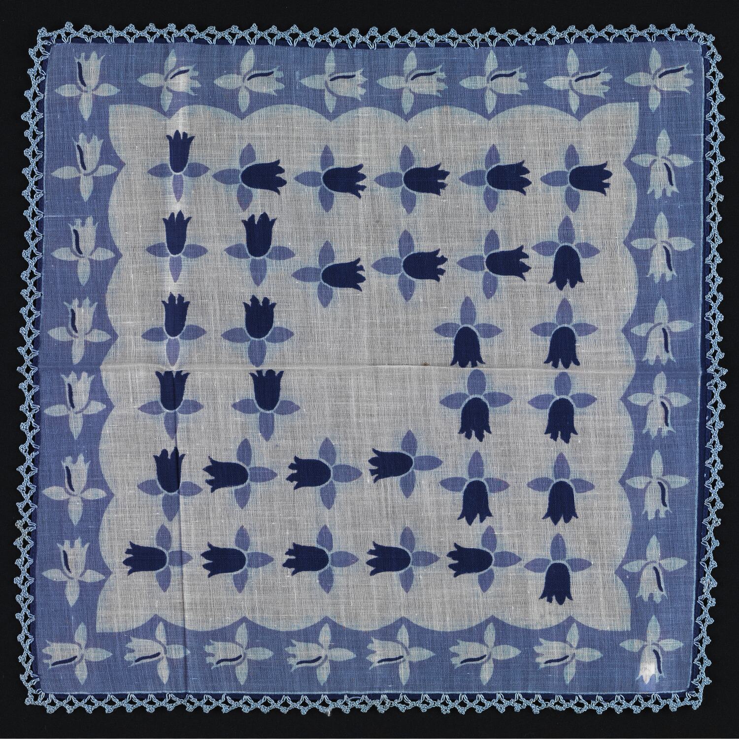 Fine cotton handkerchief with printed design of daffodils in various shades of blue. Edging features crochet in light blue cotton.