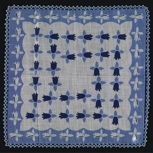 This printed handkerchief features an added crocheted edging. It belonged to Emily Hannah Francis, of Garden City, and was part of a collection of 145 souvenir and commemorative handkerchiefs put together by Emily, sent to her by pen friends from around the world, up to her death in 1943.