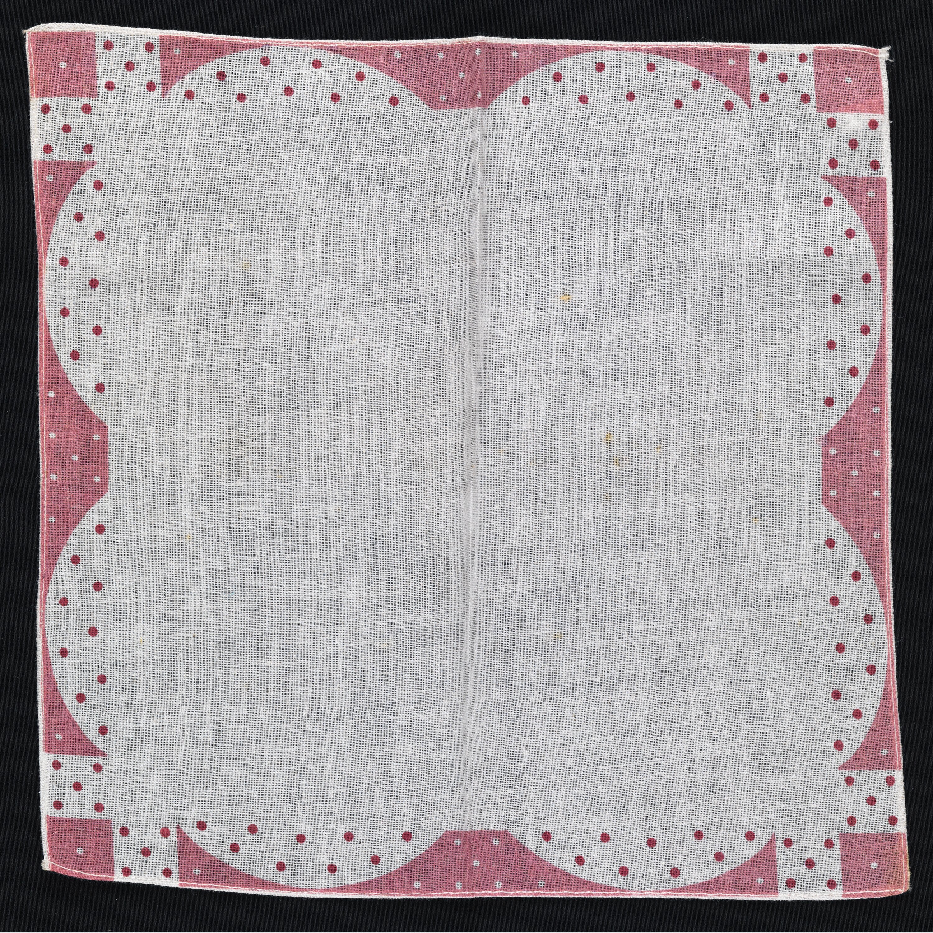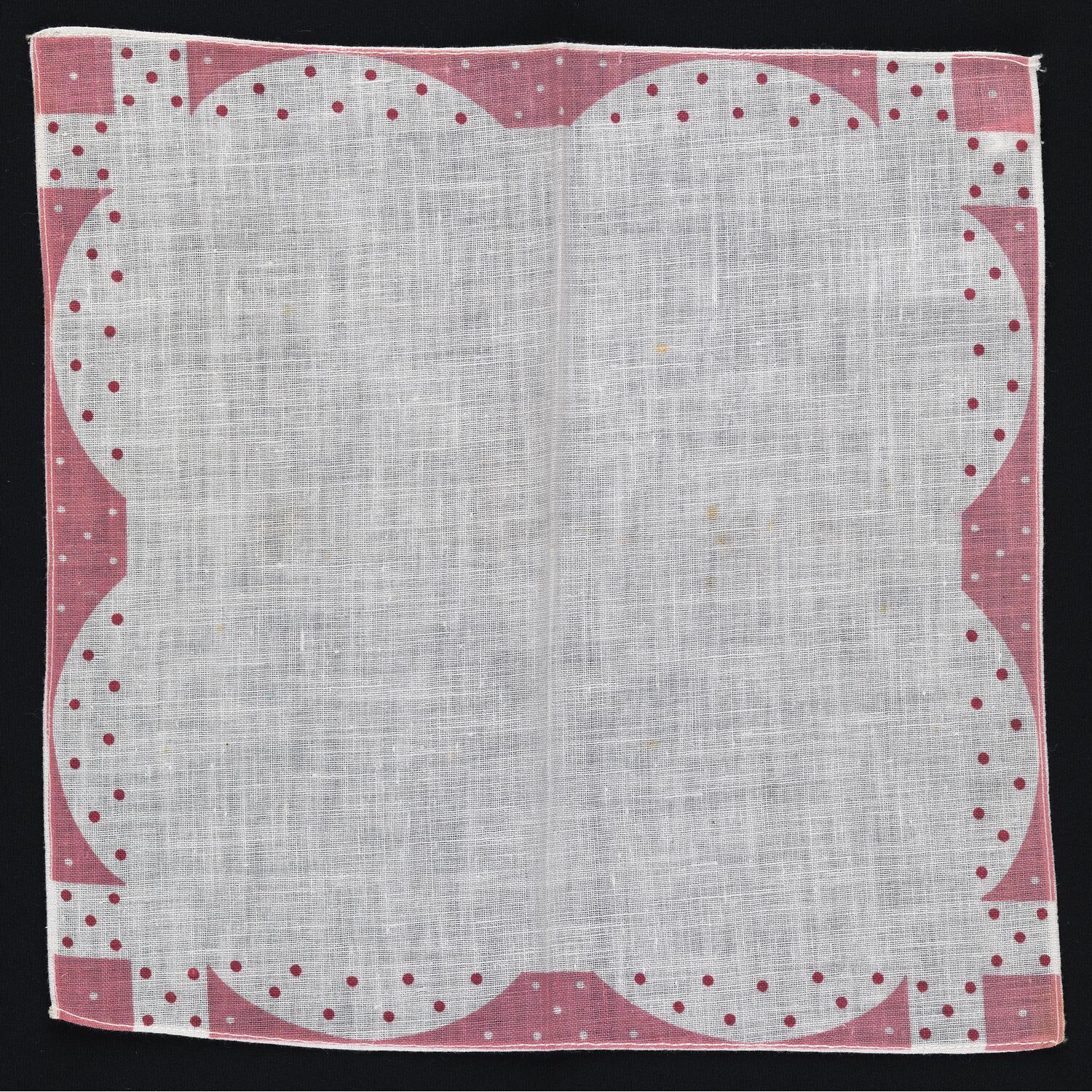 Printed white cotton handkerchief with pink geometric border and red and white spots.