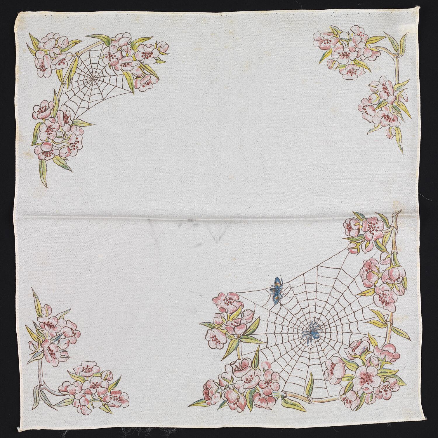 White rayon handkerchief with machine-stitched edge. Features assymetrical pink flower motifs in each corner with pale green and blue leaves. Two corners feature cobwebs strung between the flowers. In the largest cobweb, a spider sits in the centre and a flying insect is trapped at the web's edge.