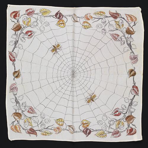 White rayon handkerchief with machine-stitched edge. Features large centralised cobweb with two flying insects caught in it. This is bordered by a wreath of autumnal leaves and berries. These and the insects are highlighted in shades of red, brown, orange and yellow.