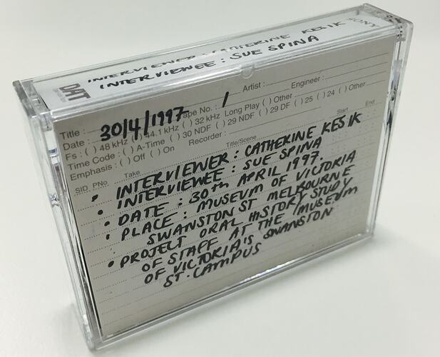 [on tape] SONY PDP-124 / ORIGINAL MASTER / INTERVIEWER: C. KESIK 30.04.97 / INTERVIEWEE: S. SPINA / For Professional Use / DAT / Digital Audio Recording [on paper sleeve inside cover] 30.04.97 / INTERVIEWER: CATHERINE KESIK / INTERVIEWEE: SUE SPINA / DATE: 30TH APRIL 1997 / PLACE: MUSEUM OF VICTORIA, SWANSTON ST MELBOURNE / PROJECT: ORAL HISTORY OF STAFF AT THE MUSEUM OF VICTORIA'S SWANSTON ST CAMPUS