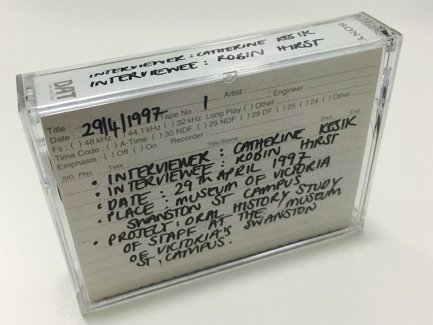 [on tape] SONY PDP-124 / ORIGINAL MASTER / INTERVIEWER: C. KESIK 29.04.97 / INTERVIEWEE: R. HIRST / For Professional Use / DAT / Digital Audio Recording [on paper sleeve inside cover] 29.04.97 / INTERVIEWER: CATHERINE KESIK / INTERVIEWEE: ROBIN HIRST / DATE: 29TH APRIL 1997 / PLACE: MUSEUM OF VICTORIA, SWANSTON ST MELBOURNE / PROJECT: ORAL HISTORY OF STAFF AT THE MUSEUM OF VICTORIA'S SWANSTON ST CAMPUS