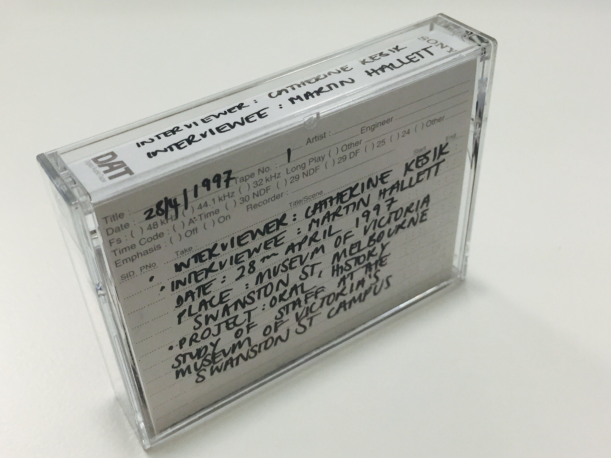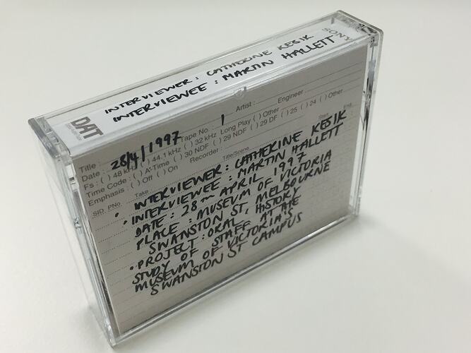 [on tape] SONY PDP-124 / ORIGINAL MASTER / INTERVIEWER: C. KESIK 28.04.97 / INTERVIEWEE: M. HALLETT / For Professional Use / DAT / Digital Audio Recording [on paper sleeve inside cover] 28.04.97 / INTERVIEWER: CATHERINE KESIK / INTERVIEWEE: MARTIN HALLETT / DATE: 28TH APRIL 1997 / PLACE: MUSEUM OF VICTORIA, SWANSTON ST MELBOURNE / PROJECT: ORAL HISTORY OF STAFF AT THE MUSEUM OF VICTORIA'S SWANSTON ST CAMPUS