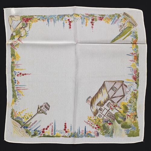 White rayon handkerchief with machine stitched edge. Features a printed cottage garden scene with a thatched cottage, fountain, pond and birdhouse. Many coloured cottage garden flowers form a border.