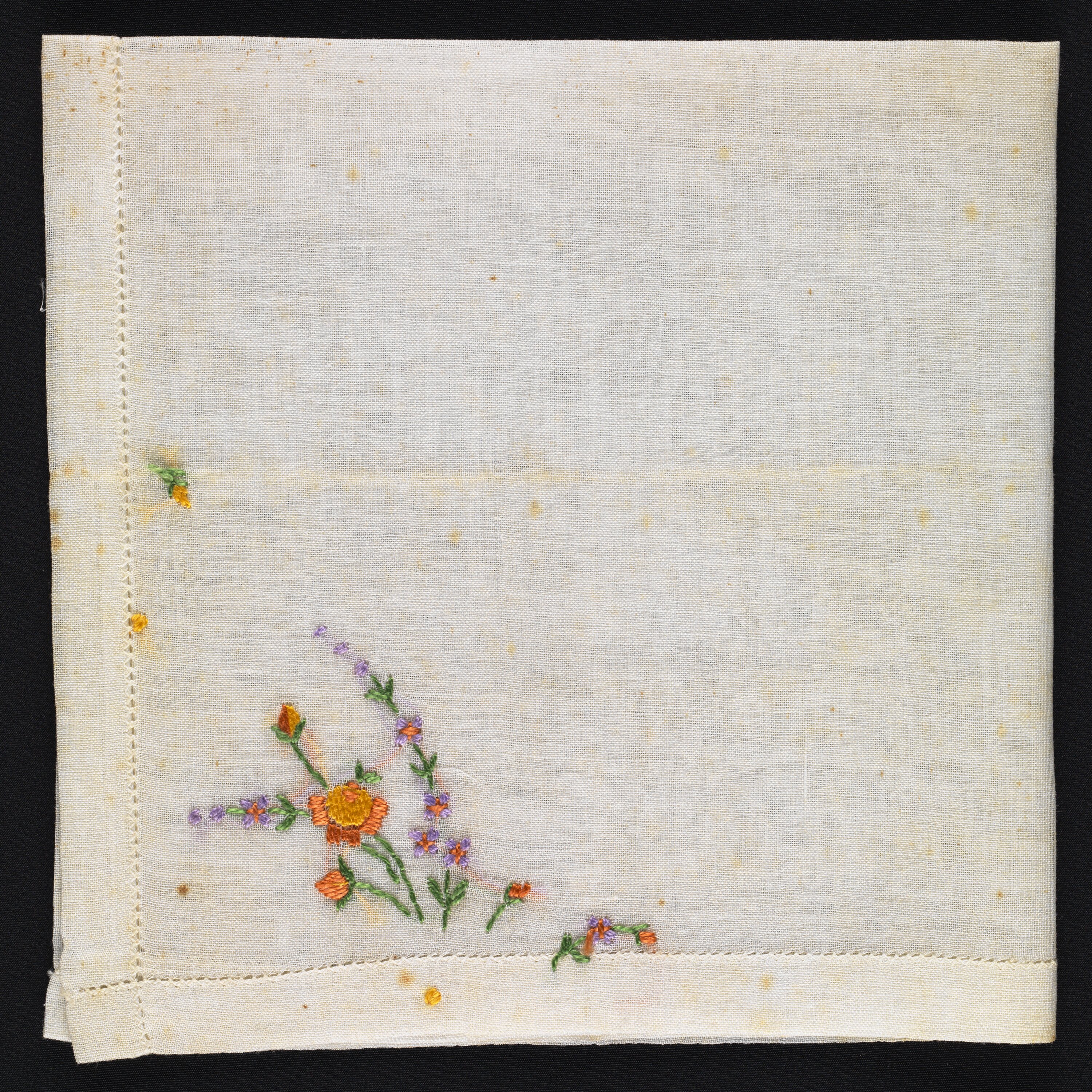 White cotton handkerchief with finished edge and hand embroidered spring of flowers in one corner (orange, yellow, lavender and green silk).