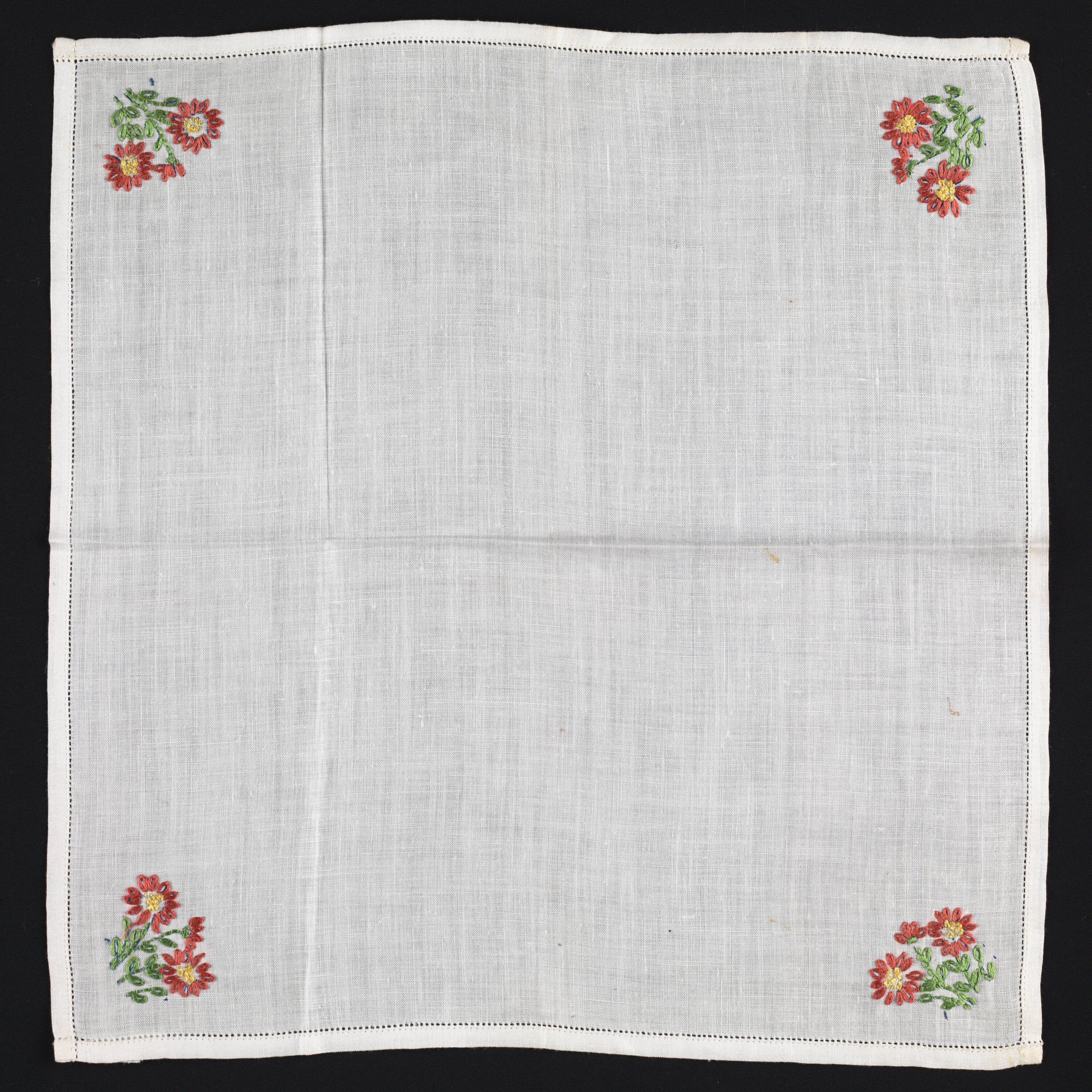 This handkerchief shows evidence of the embroidery design transfer beneath the stitching.