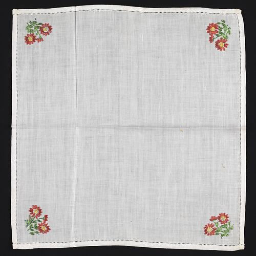 White cotton handkerchief with finished edge, featuring an embroidered sprig of flowers in one corner (dark pink and green silk). The transfer print ink shows through.
