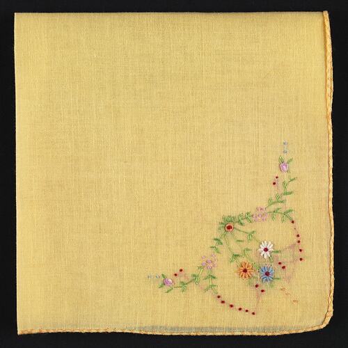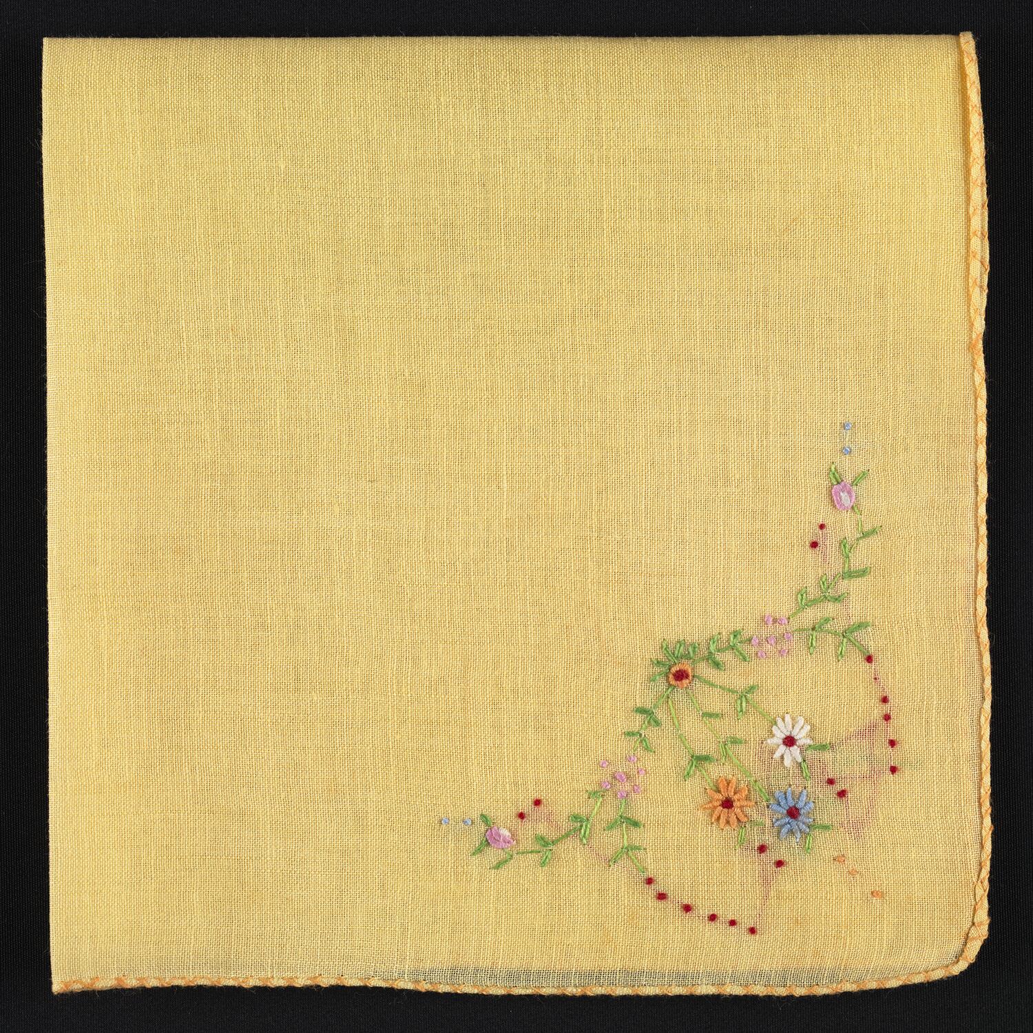 Yellow cotton handkerchief with finished edge, embroidered with four sprigs of flowers, one in each corner (red, green and yellow cotton). A larger, more complex motif in one corner features additional pale pink, pale blue and white cotton flowers.