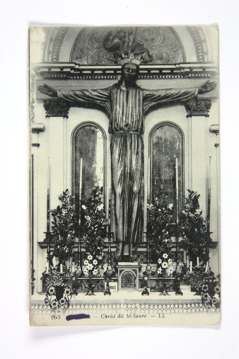 Printed on front: '263 - [obscured ] - 'Christ dit St Sauve. - LL'. Printed on back: 'Carte Postale / Correspondance / Adresse / Modele Depose' Hand-written on back: 'Dearest Sister / Just a card / from a photo of a statue in / one of the Cathedrals in France / it is a beautiful place inside / I was in the place. / I must close now Dear Sister, Farewell My Dearest Sister until I write again / I remain always & ever your very / loving & Faithful Brother Bill / write soon'.