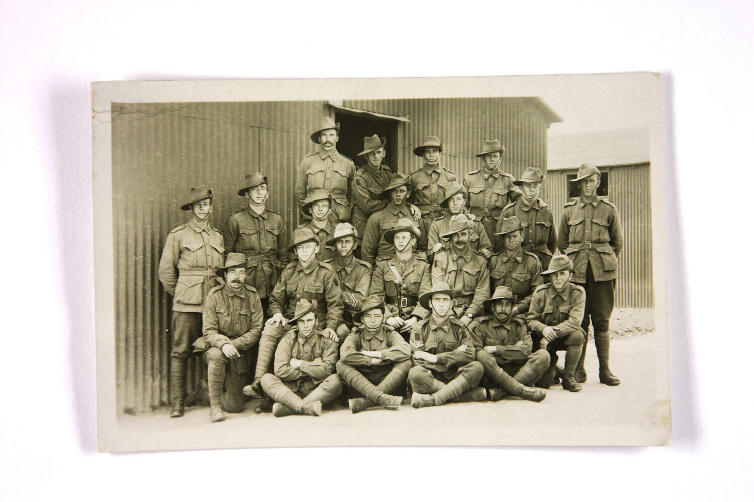 Postcard featuring a black and white portrait of 22 uniformed Australian soldiers in four informal rows, in front of two tin sheds. The soldiers' uniforms include slouch hats and puttees. The reverse of the postcard has extensive hand-writing over a printed postcard format.