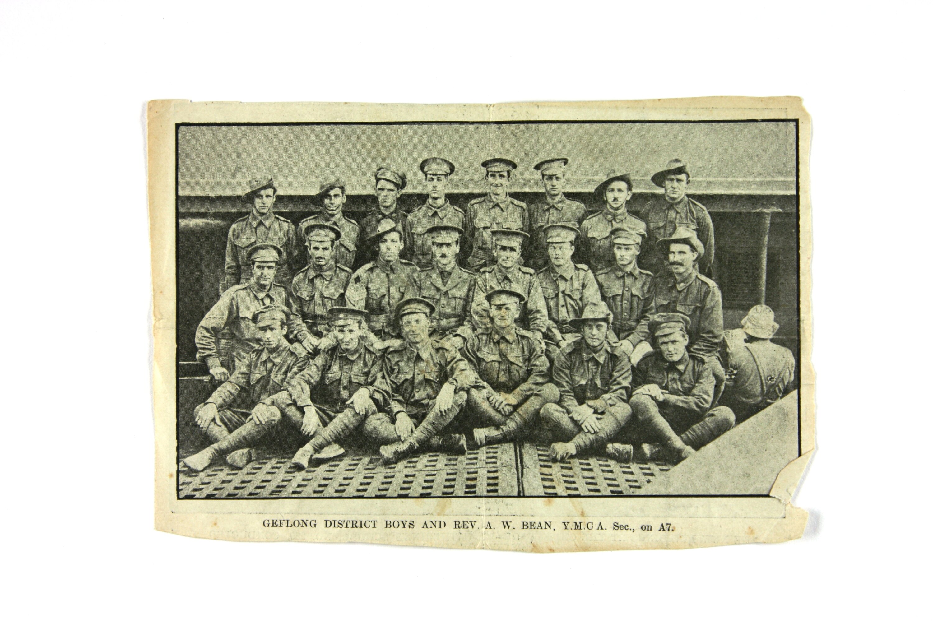 Newspaper cutting, rectangular, printed on both sides. Front: black and white portrait taken on a ship of 22 uniformed Australian soldiers in three informal rows, with an additional man seated with his back to the camera, wearing soft cap and braces. The soldiers' uniforms include peaked and slouch hats and puttees. The image has a line border and inscription below. Back: a wooden building apparently recently constructed, with a group of children standing outside. The image has a line border and inscription below. The newspaper cutting has losses at a strong vertical centre fold, and has also been folded horizontally.