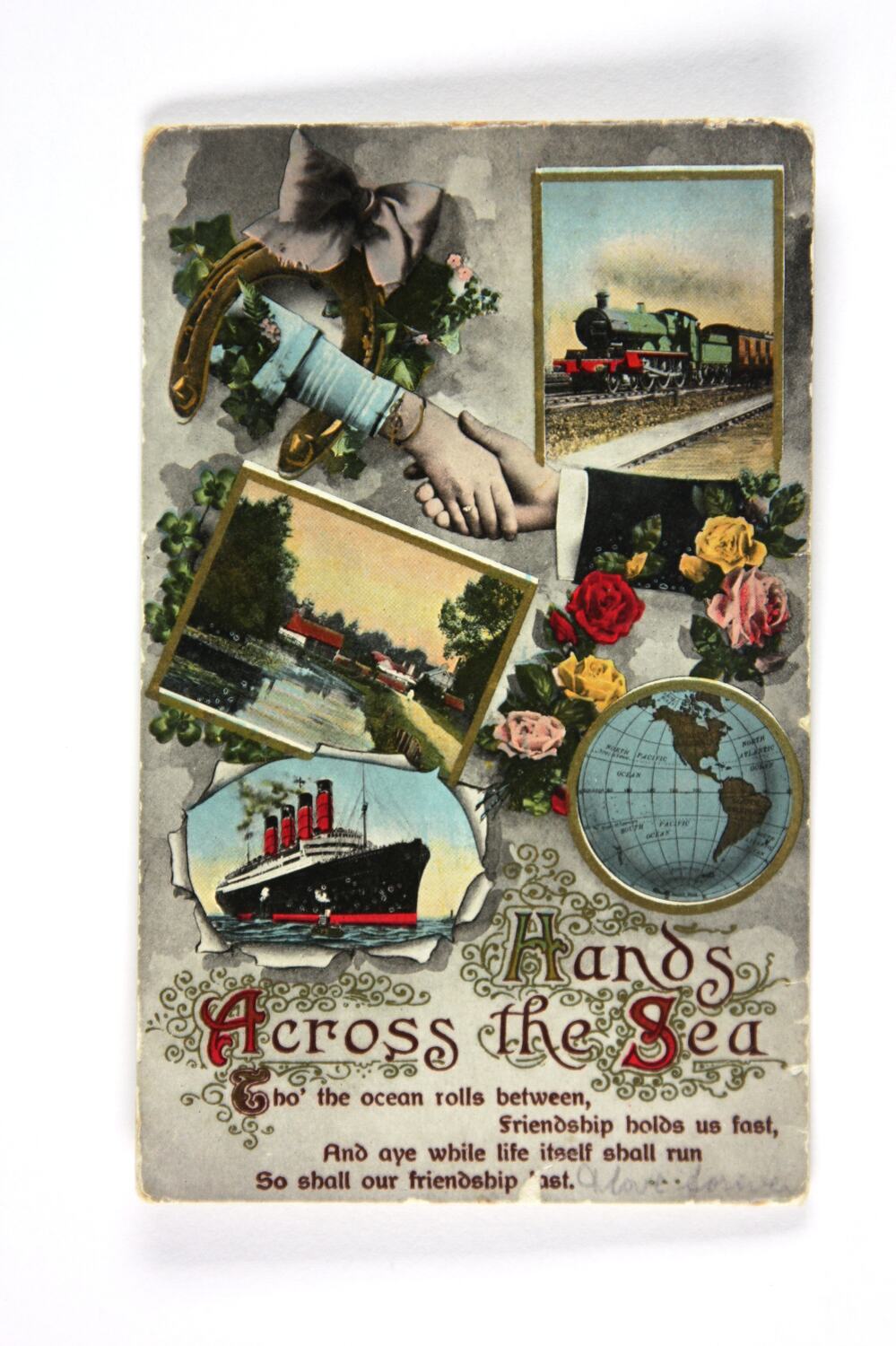 Postcard printed in full colour with drawn and photographic images in collage, symbolising connections between nations: a woman's hand extending through a horseshoe, shaking a man's hand; a steam train; an ocean liner; a English rural scene, a world globe showing south and north America; roses and foliage; and an embellished inscription. Printed on reverse with postcard proforma, over which is extensive hand-writing. The corners of the postcard are slightly curled; edges have losses throughout.