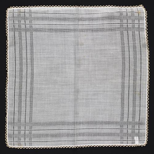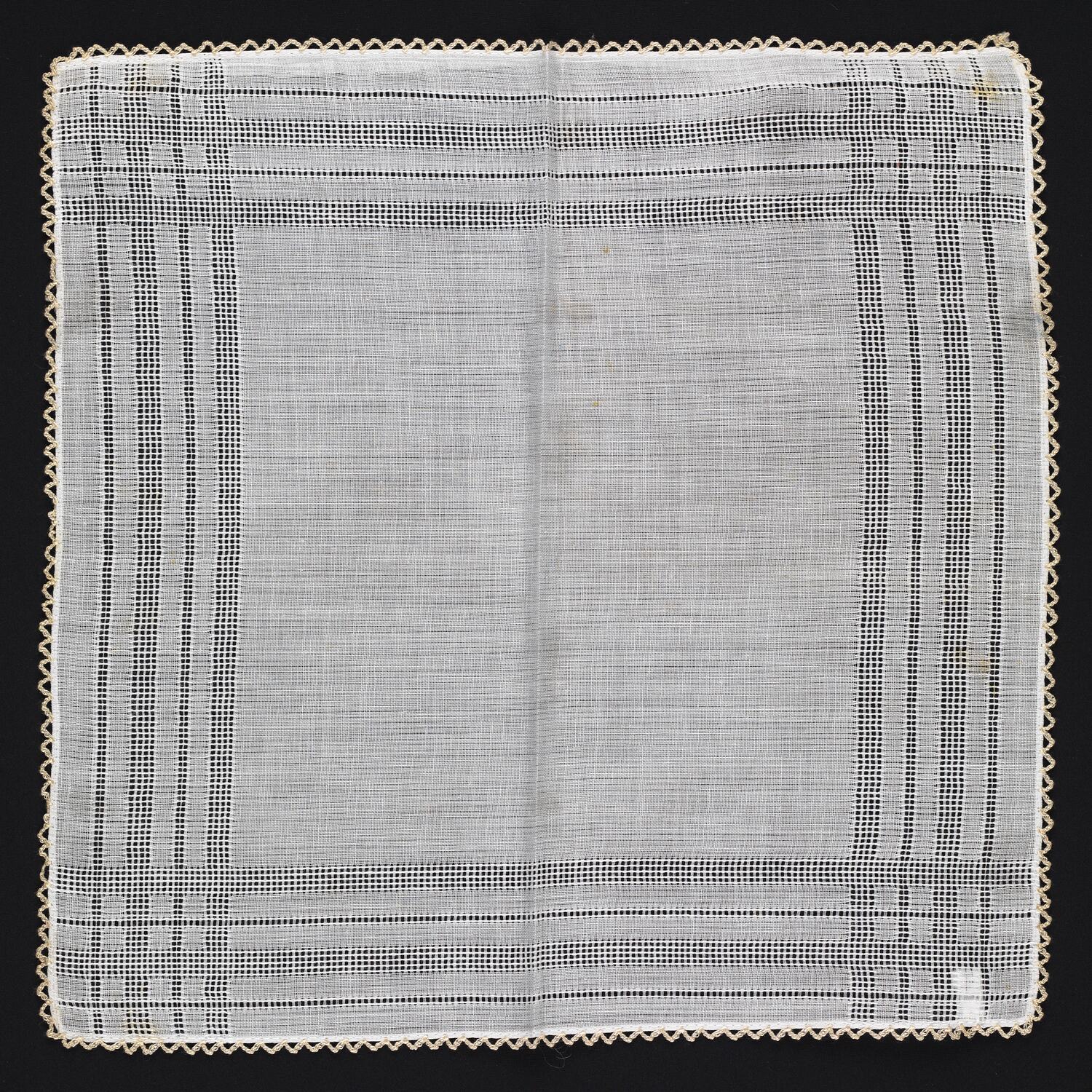 White cotton handkerchief with crocheted decorative zig zag edging in beige cotton. Features extensive drawn thread work to make a grid line pattern around the border.