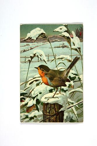 Postcard printed with a full-colour image of a red-breasted robin standing on a snow-covered fence post, looking at a rural scene blanketed with snow. Printed at lower right: 'Alitter' [?]. The back of the postcard is printed with a postcard proforma, with a line down centre, which the author has written across. The postcard has minor damage at edges and corners.