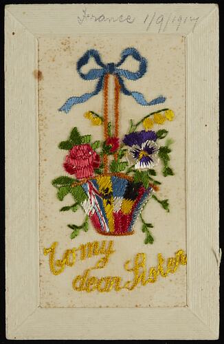 Embroidered on front: 'To my / dear Sister'. Hand-written at top: 'France 1/9/917'. Printed on back: 'Fabrication francaise'. Hand-written on back: 'God / bless & / protect / you / Dear / Sister / France / 1/9/1917 / To my Dearest Sister / With the best of / health, luck & good wishes from / your ever loving & Faithful Brother / I am thinking of ... today / Sarah...only wish [that?] I could / see you & the little children. Do not / worry for me Sarah, as you have / enough worry & i am alright. / Farewell Dearest Sister till I write / again. / I Remain your ever loving Faithful Brother Will'.