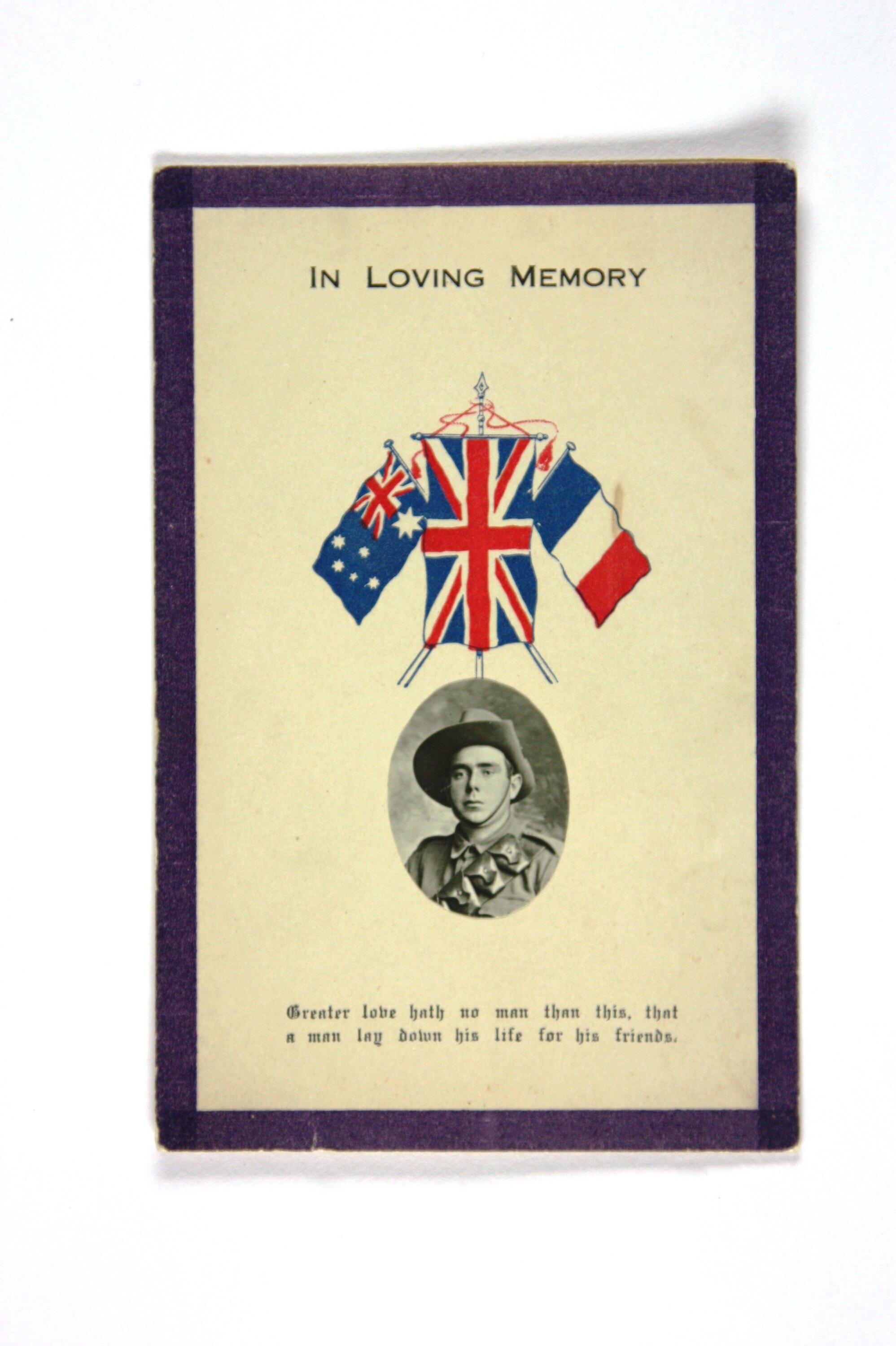 Folded card, forming four sides. Cover is printed in blue, red, purple and black on off-white. Features an oval photographic portrait, head and shoulders, of a soldier wearing an ammunition belt and slouch hat. Above are the coloured flags of Australia, Britain and France. Inscription above and below; purple border around edge. Inside pages have extensive printed inscriptions; back is blank. The card has small sections of discolouration and foxing.